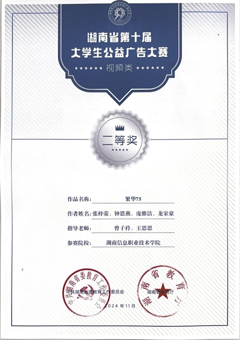 在湖南省第十届大学生公益广告大赛中,best365官网学子表现优异,斩获佳绩。由张梓荣、钟思燕、庞雅洁、龙家豪同学创作,曾子衿、王思思老师指导的视频类作品《繁华 75》荣获大赛二等奖。