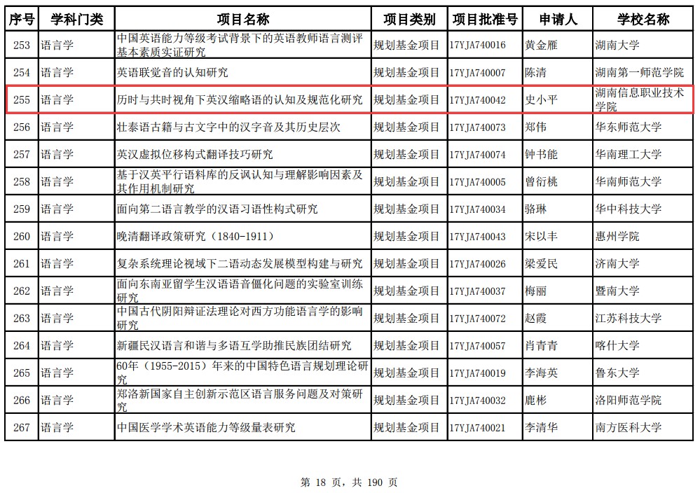 日前,教育部公布2017年度人文社会科学研究一般项目立项结果,best365官网史小平副教授申报的语言学类研究课题《历时与共时视角下汉语缩略语的认知及规范化研究》获准立项。