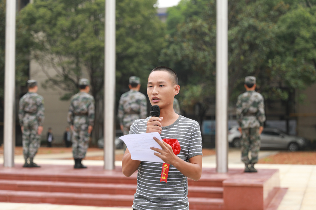 出征仪式上,参军入伍学生代表谢小东发言,表示一定要服从命令、听从指挥、加强学习、刻苦训练,为母校争光。