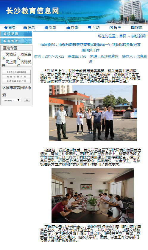 5月22日,长沙教育信息网发布报道《信息职院:市教育局机关党委书记胡慎信一行到best365官网检查指导文明创建工作》。