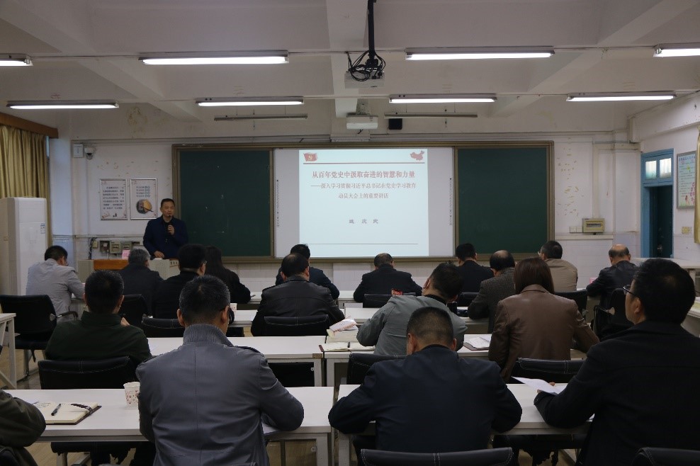 学院党委委员、纪委书记姚庆武以《从百年党史中汲取奋进的智慧和力量》为主题,带领全体院领导及学院中层正职干部重温习近平总书记在党史学习教育动员大会发表的重要讲话精神。