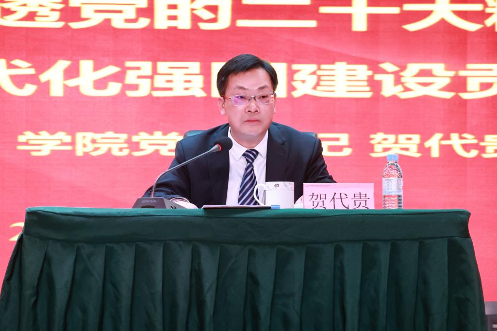 贺代贵指出,在中国式现代化全面推进中华民族伟大复兴的道路上,坚持和加强党的全面领导、坚持中国特色社会主义道路、坚持以人民为中心的发展思想、坚持深化改革开放、坚持发扬斗争精神。他表示,我们要坚持为党育人为国育才,全面提高人才培养质量,着力造就高素质技术技能人才,聚天下英才而用之。他强调,青年强则国家强,广大青年要坚定不移听党话、跟党走,怀抱梦想又脚踏实地,敢想敢为又善作善成,立志做有理想、敢担当、能吃苦、肯奋斗的新时代好青年,让青春在全面建设社会主义现代化国家的火热实践中绽放绚丽之花。