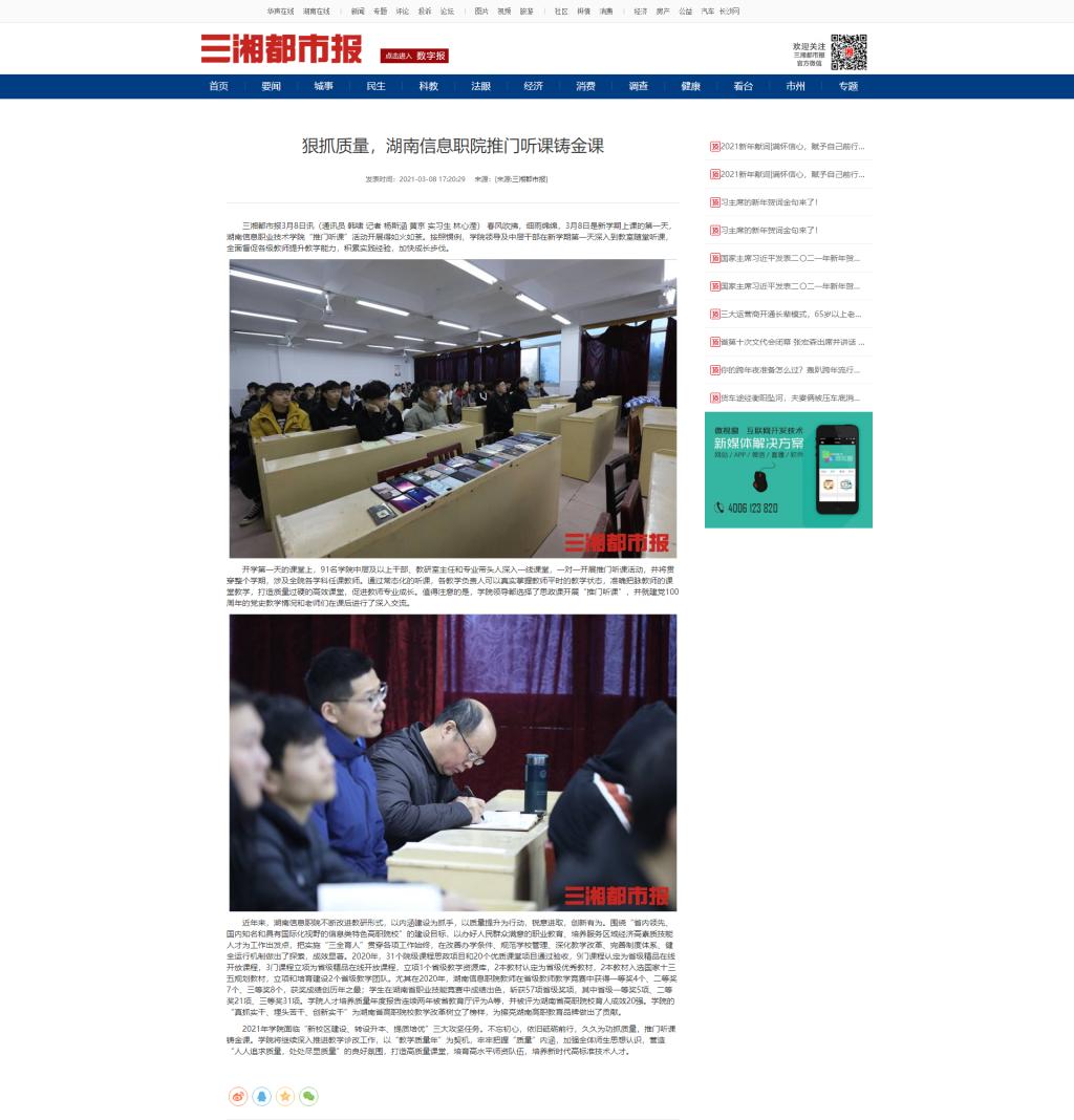 3月8日,三湘都市报发布《狠抓质量,湖南信息职院推门听课铸金课》。