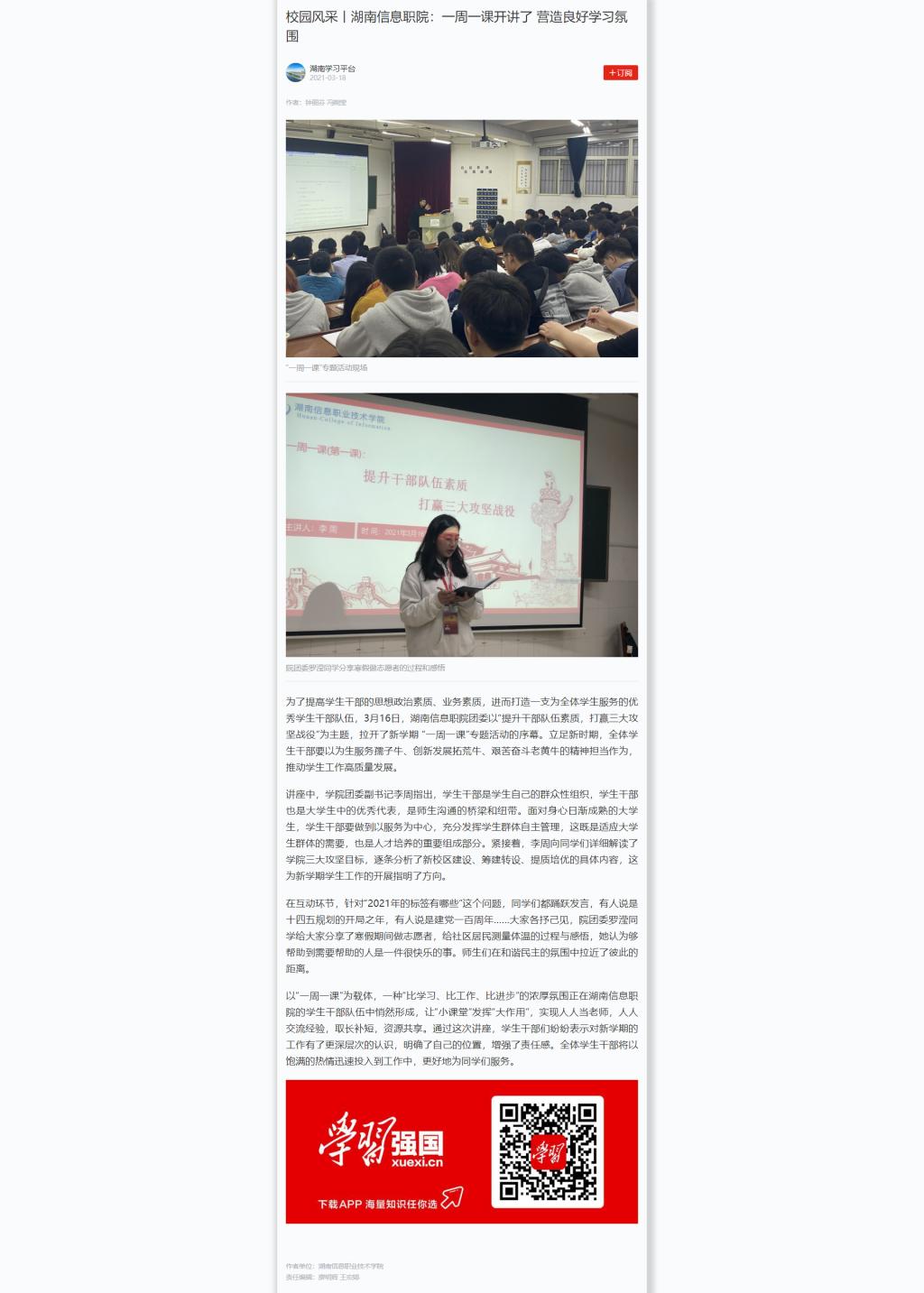 3月18日,学习强国发布《校园风采丨湖南信息职院:一周一课开讲了 营造良好学习氛围》。