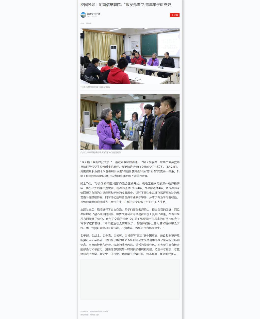 3月22日,学习强国发布《校园风采丨湖南信息职院:“银发先锋”为青年学子讲党史》。