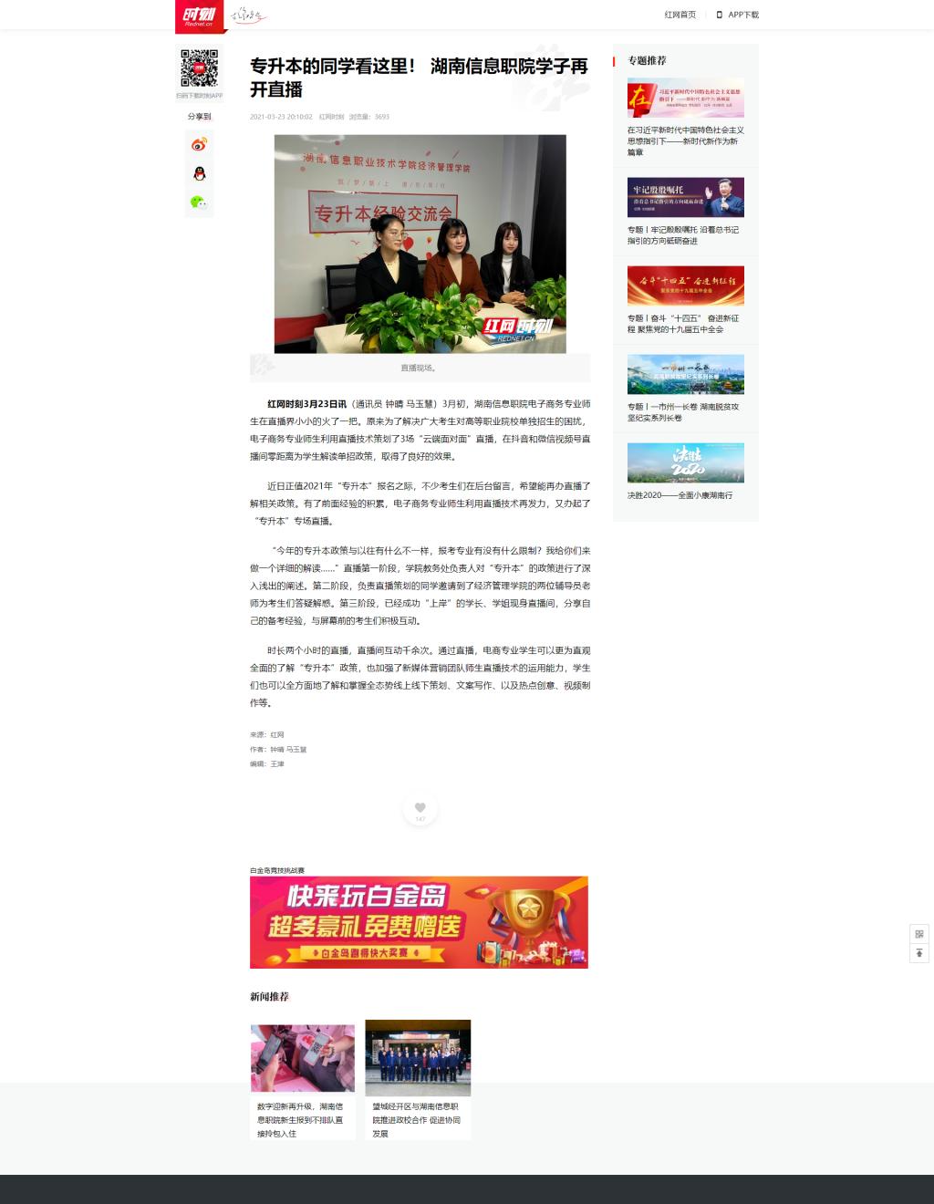 3月23日,红网发布《专升本的同学看这里! 湖南信息职院学子再开直播》。
