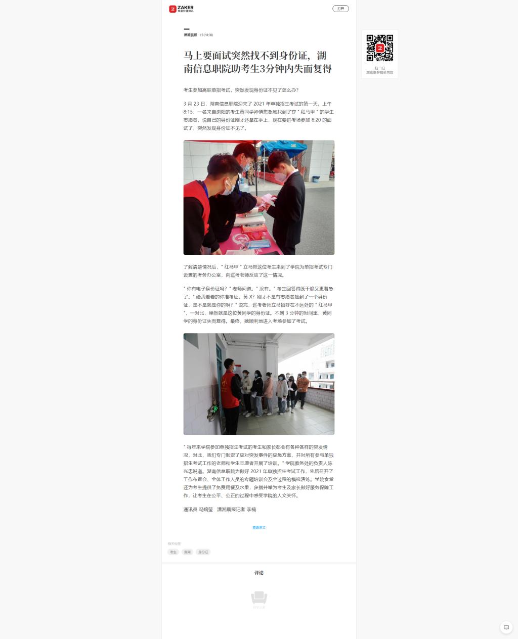 3月23日,潇湘晨报发布《马上要面试突然找不到身份证,湖南信息职院助考生3分钟内失而复得》。