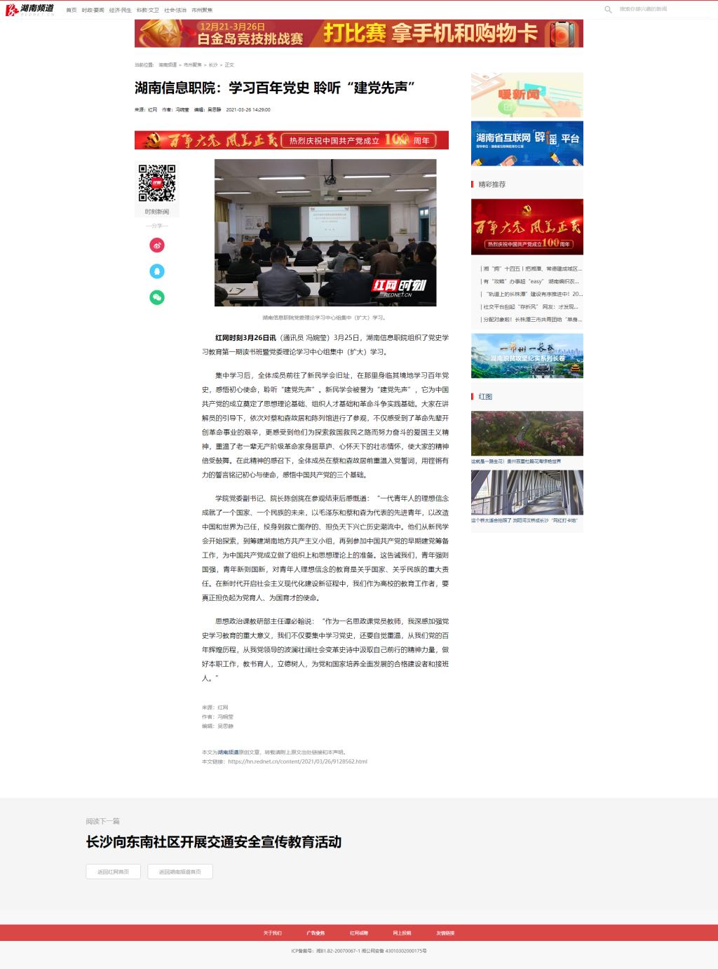 3月26日,红网发布《湖南信息职院:学习百年党史 聆听“建党先声”》。