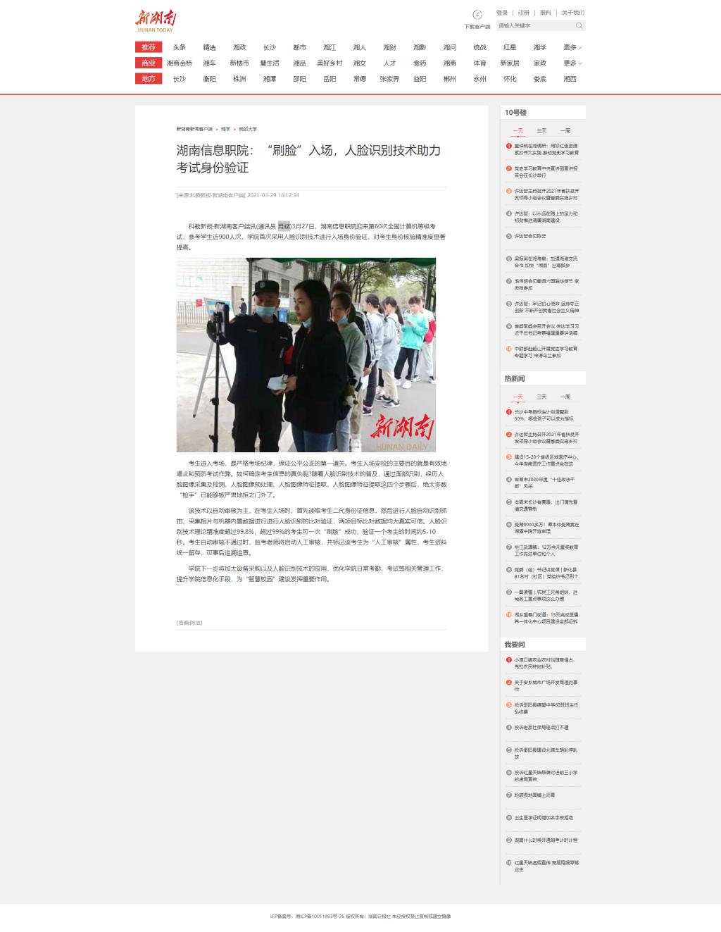 3月29日,新湖南发布《湖南信息职院:“刷脸”入场,人脸识别技术助力考试身份验证》。