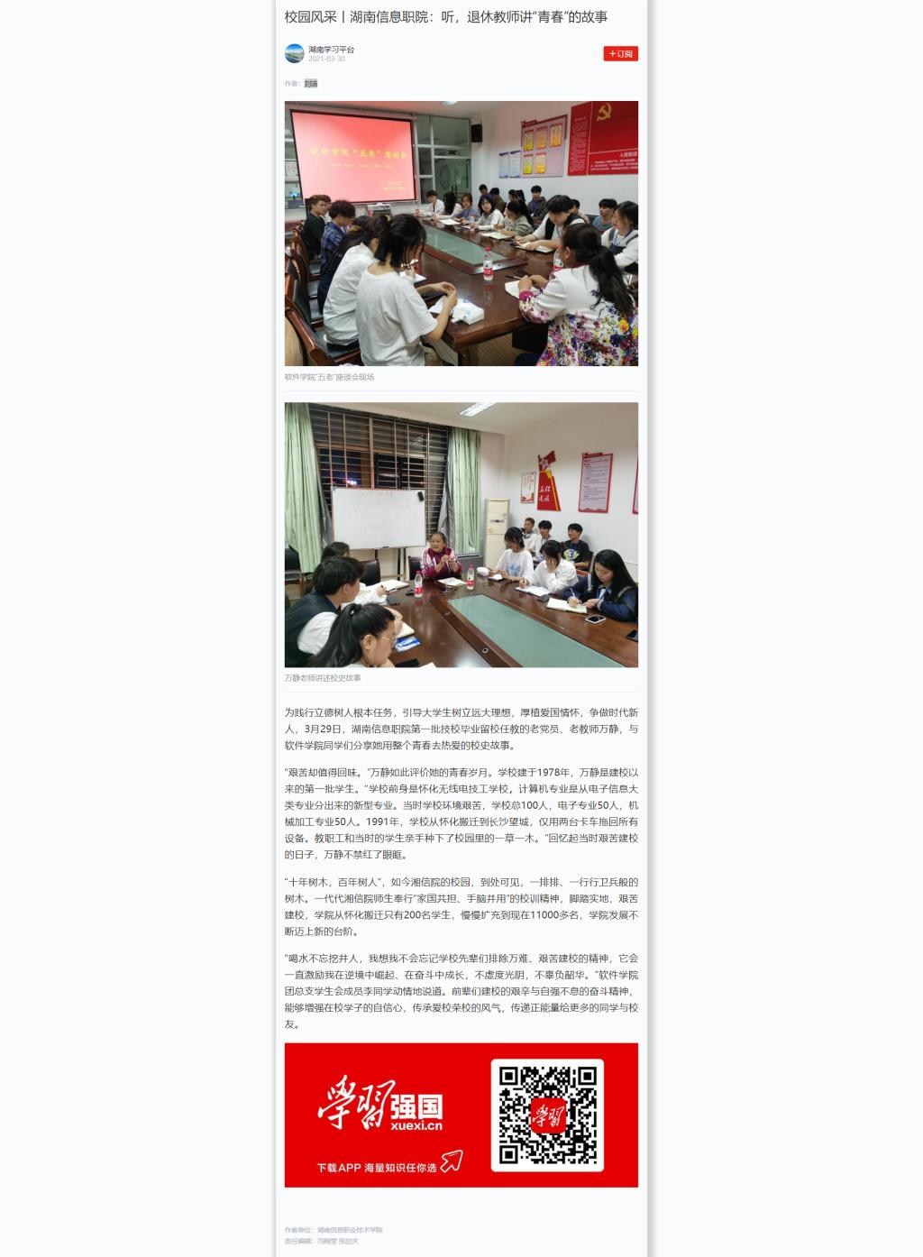 3月30日,学习强国发布《校园风采丨湖南信息职院:听,退休教师讲“青春”的故事》。