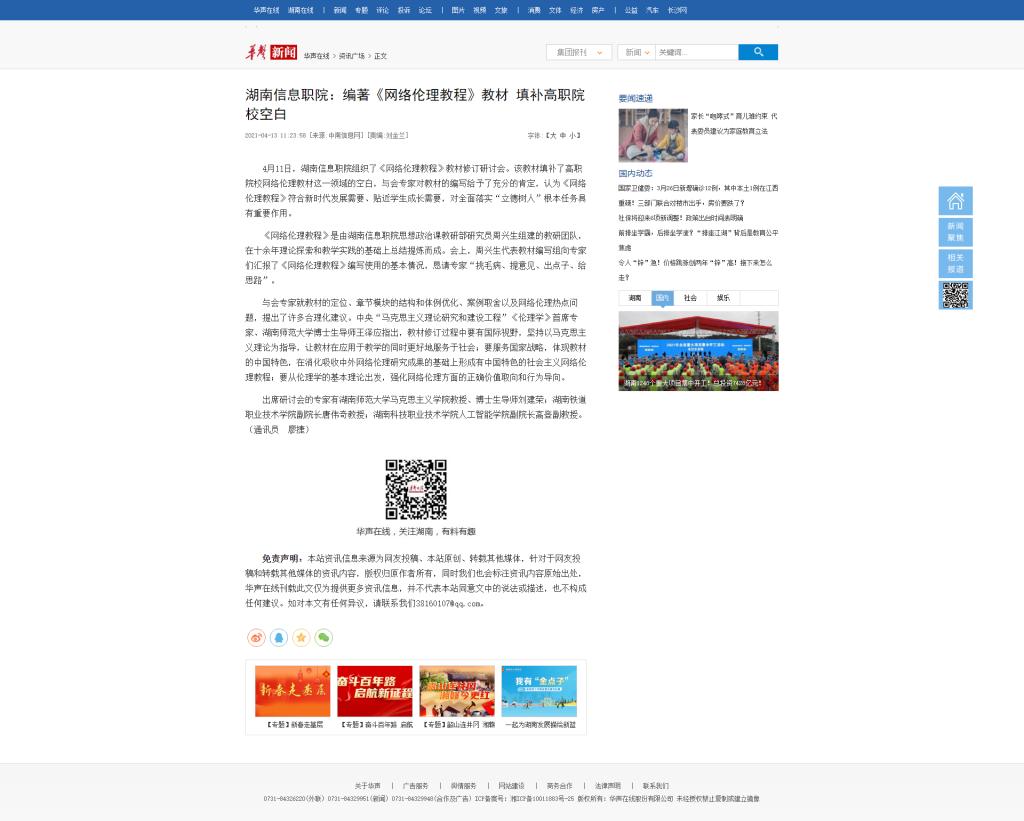 4月13日,华声在线发布《湖南信息职院:编著《网络伦理教程》教材 填补高职院校空白》。