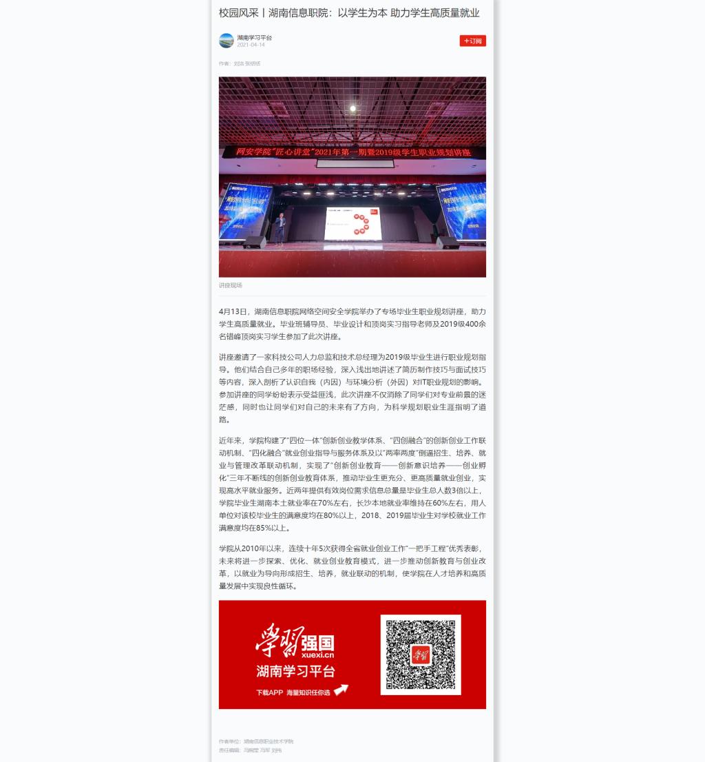 4月14日,学习强国发布《校园风采丨湖南信息职院:以学生为本 助力学生高质量就业》。