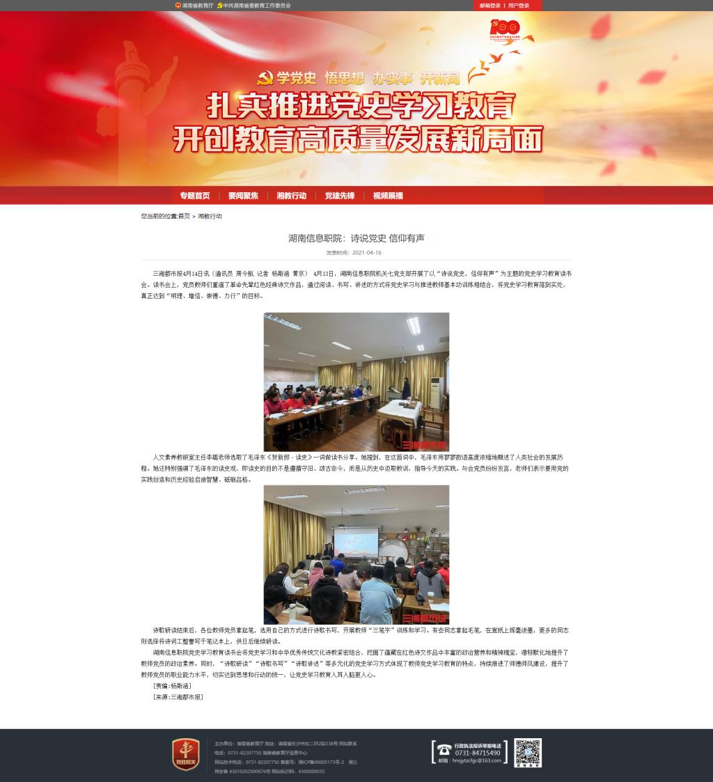 4月16日,湖南教育政务网发布《湖南信息职院:诗说党史 信仰有声》。