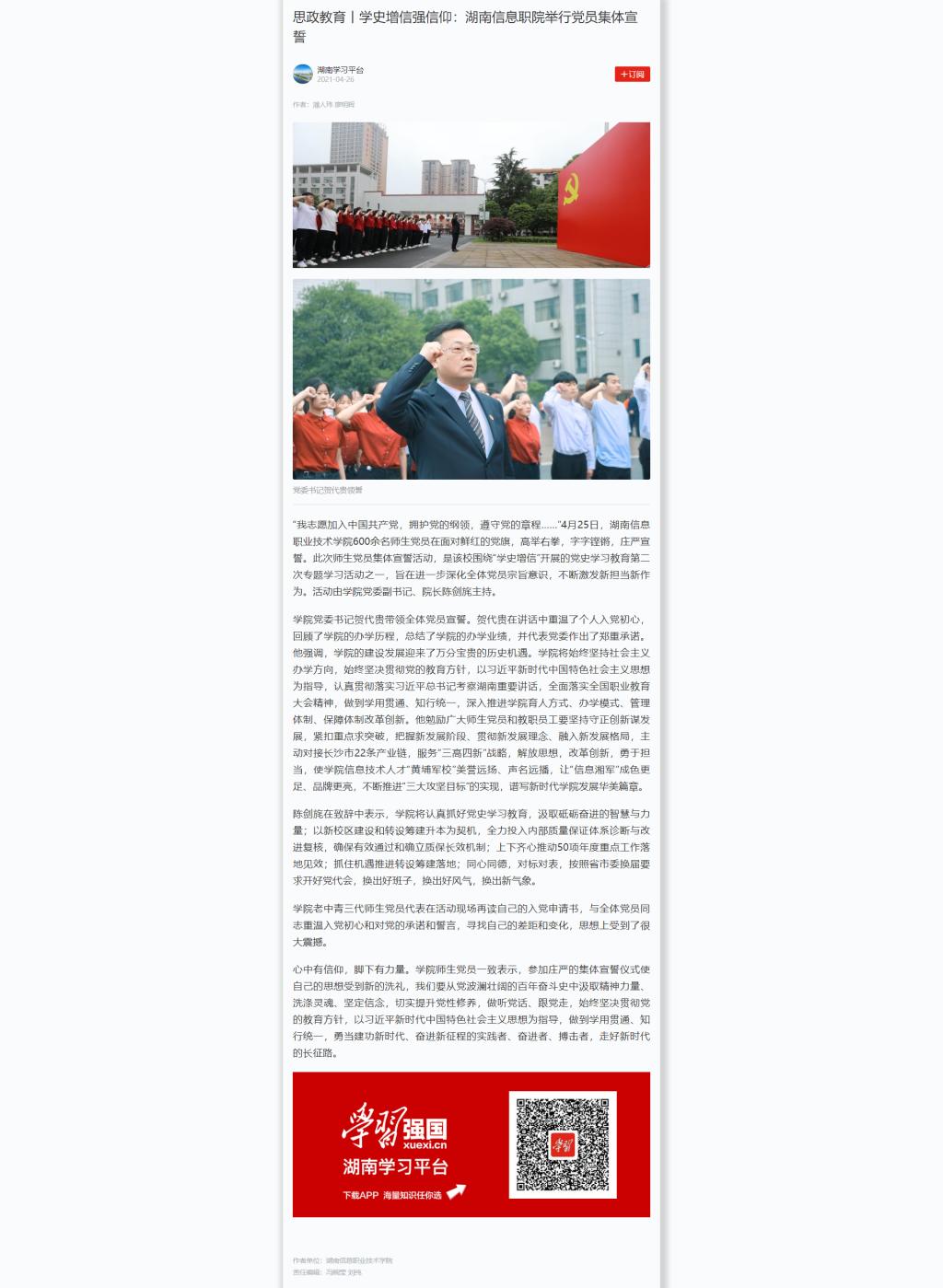 4月26日,学习强国发布《思政教育丨学史增信强信仰:湖南信息职院举行党员集体宣誓》。