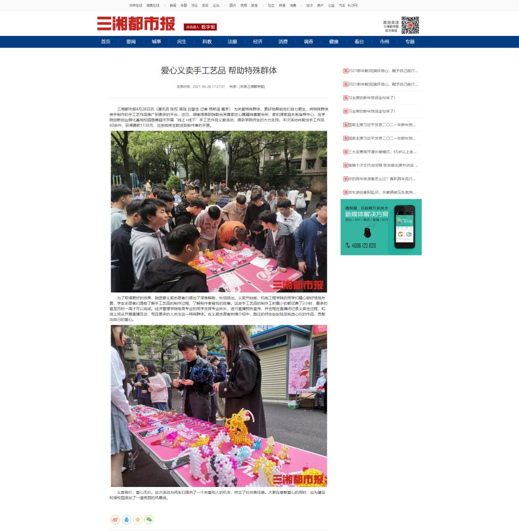 4月28日,三湘都市报发布《爱心义卖手工艺品 帮助特殊群体》。