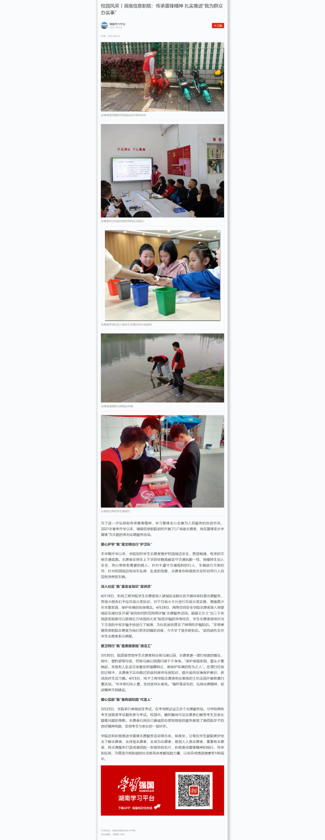 4月29日,学习强国发布《校园风采丨湖南信息职院:传承雷锋精神 扎实推进“我为群众办实事”》。