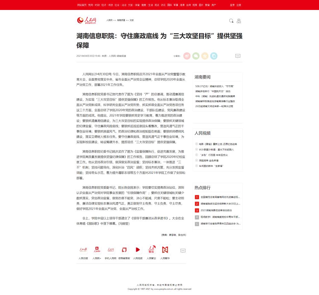 4月30日,人民网发布《湖南信息职院:守住廉政底线 为“三大攻坚目标”提供坚强保障》。