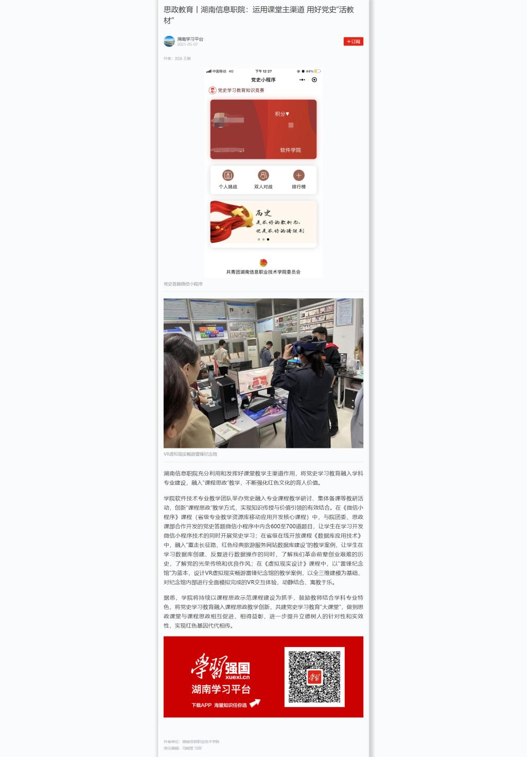 5月7日,学习强国发布《思政教育丨湖南信息职院:运用课堂主渠道 用好党史“活教材”》。