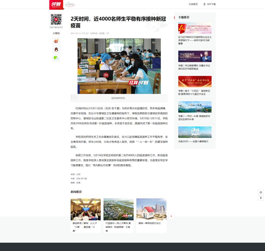 5月13日,红网发布《2天时间,近4000名师生平稳有序接种新冠疫苗》。