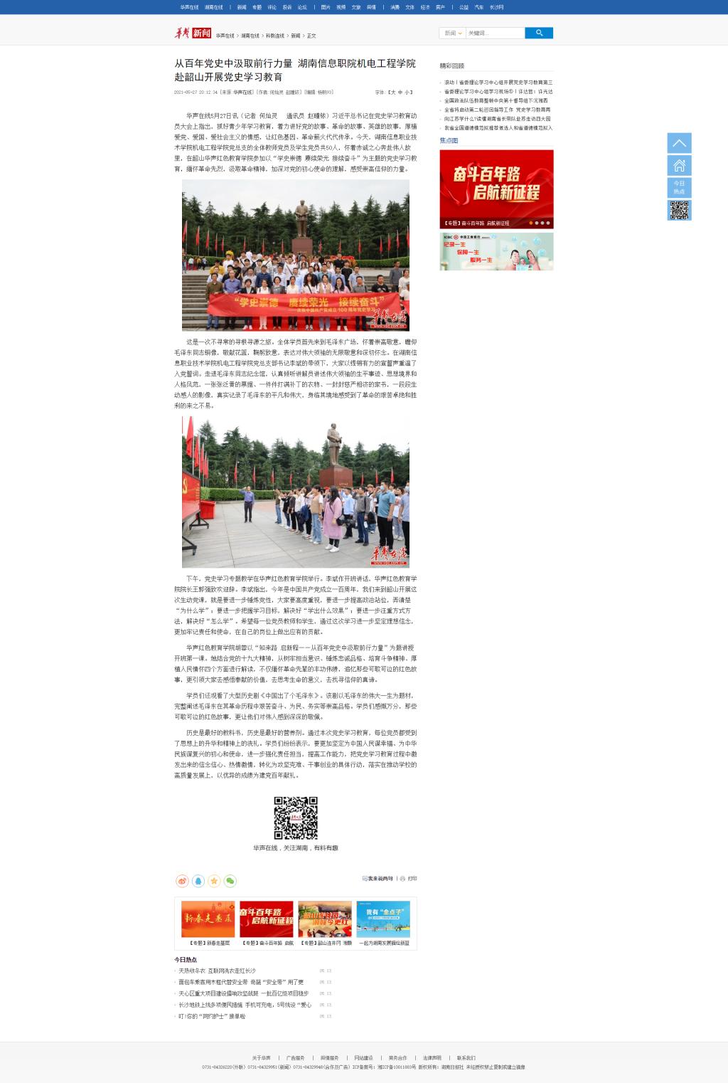 5月27日,华声在线发布《从百年党史中汲取前行力量 湖南信息职院机电工程学院赴韶山开展党史学习教育》。