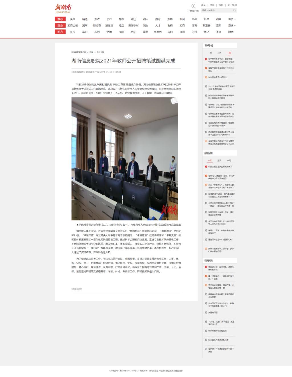 5月30日,新湖南发布《湖南信息职院2021年教师公开招聘笔试圆满完成》。