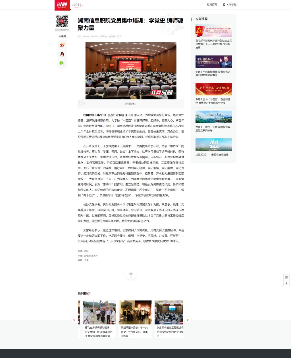 6月2日,红网发布《湖南信息职院党员集中培训:学党史 铸师魂 聚力量》。