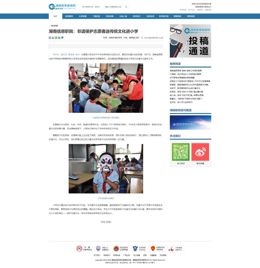 6月9日,湖南教育新闻网发布《湖南信息职院:非遗保护志愿者送传统文化进小学》。