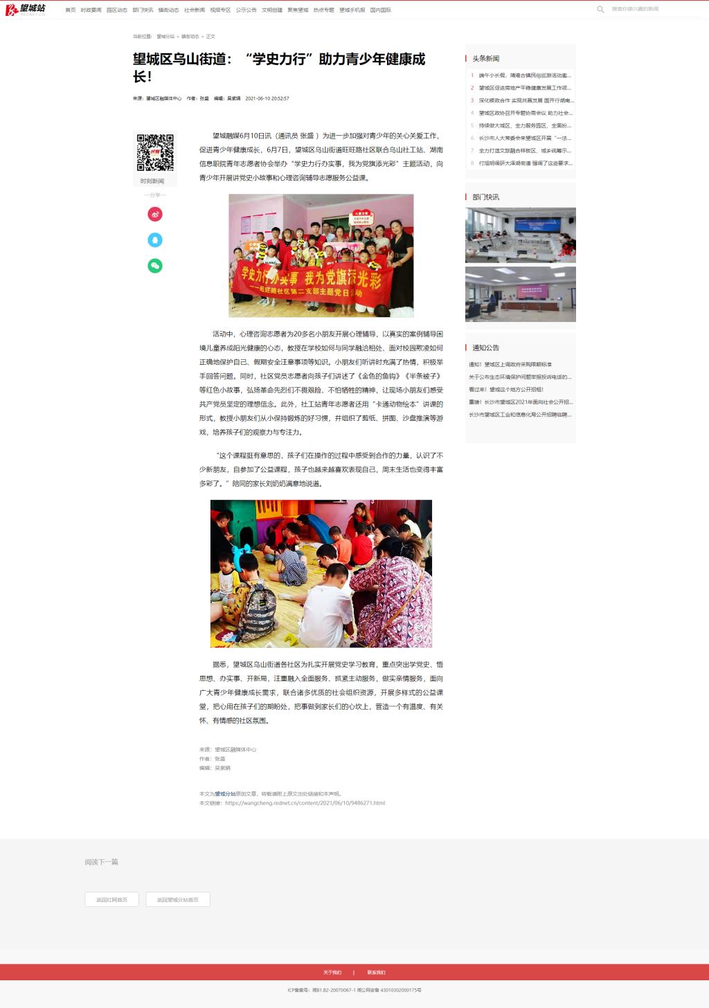 6月10日,红网发布《望城区乌山街道:“学史力行”助力青少年健康成长!》。