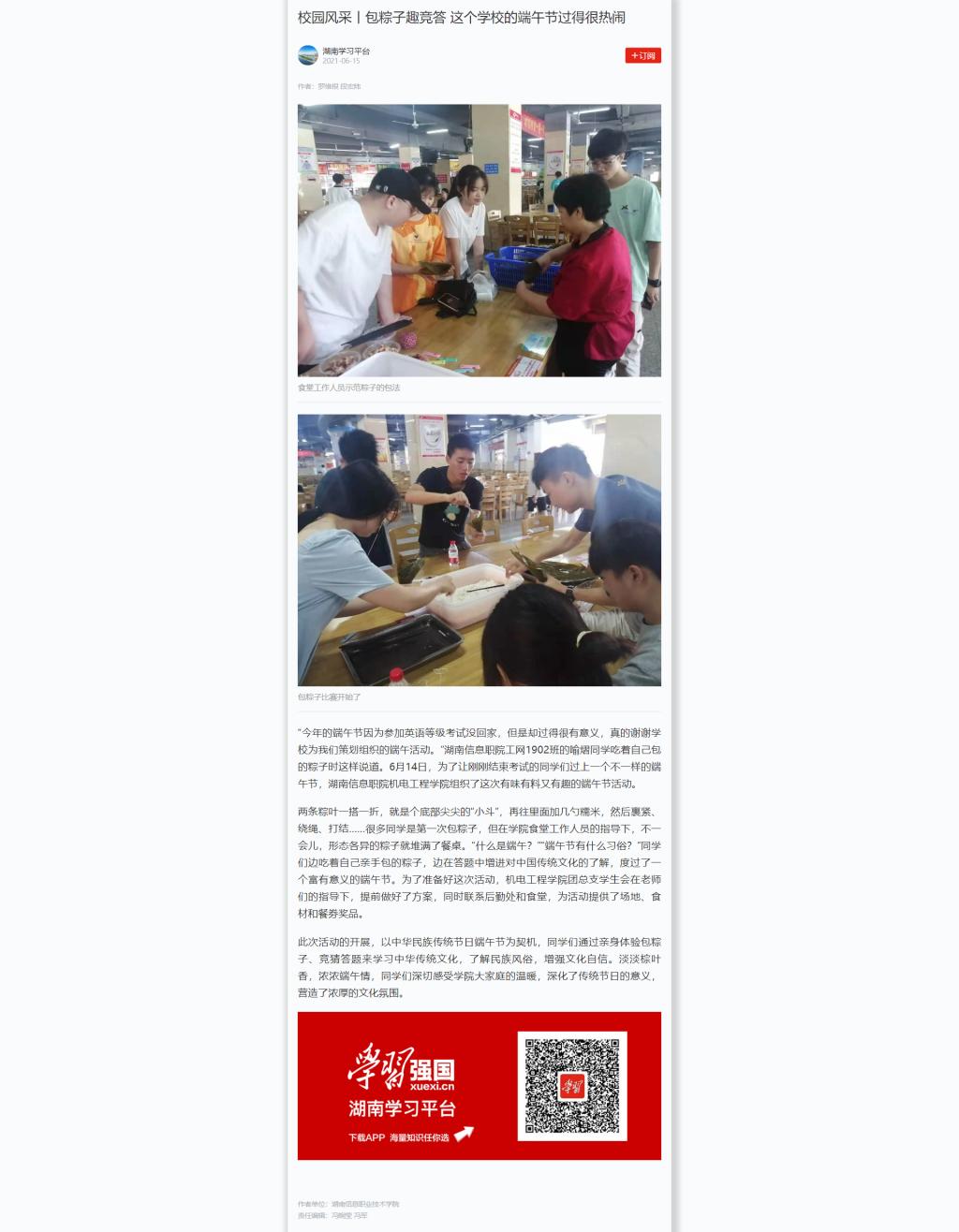 6月15日,学习强国发布《校园风采丨包粽子趣竞答 这个学校的端午节过得很热闹》。