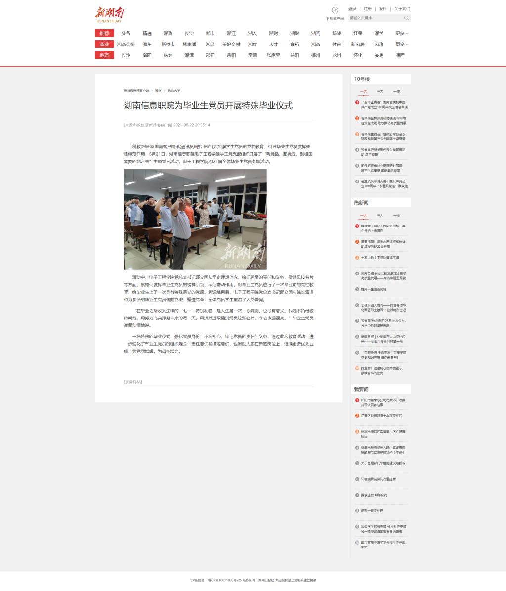 6月22日,新湖南发布《湖南信息职院为毕业生党员开展特殊毕业仪式》。