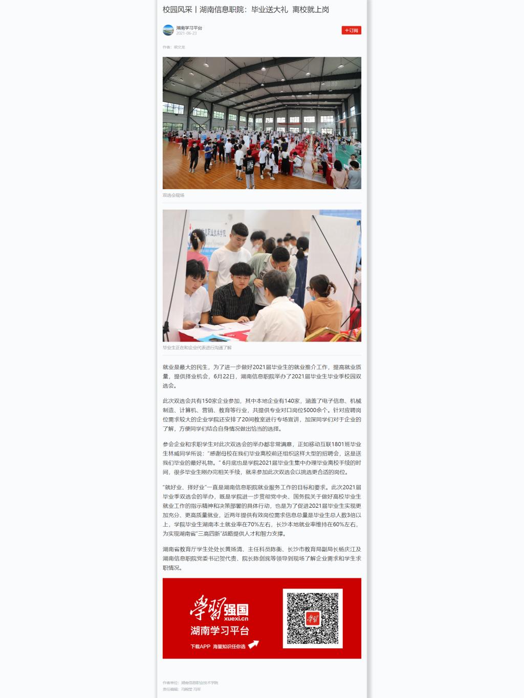 6月23日,学习强国发布《校园风采丨湖南信息职院:毕业送大礼 离校就上岗》。