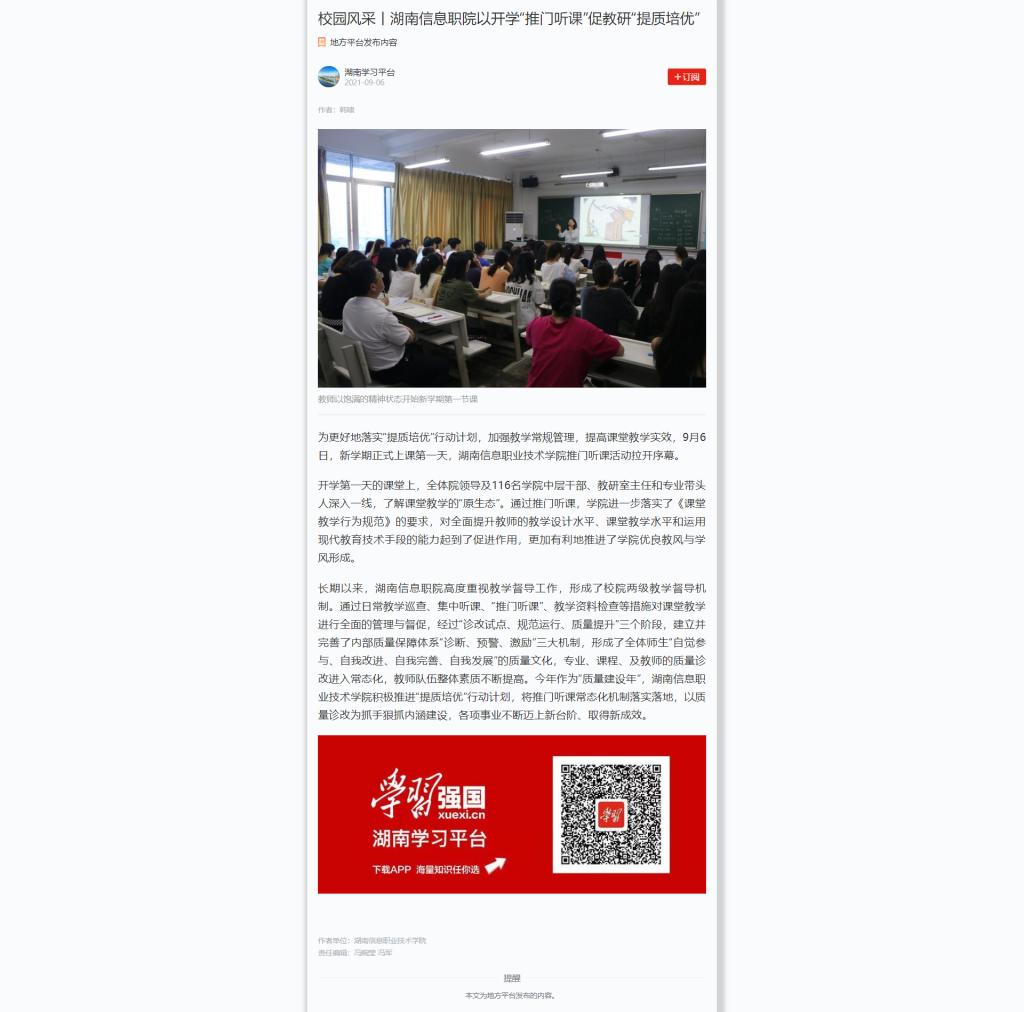 9月6日,学习强国发布《校园风采丨湖南信息职院以开学“推门听课”促教研“提质培优”》。
