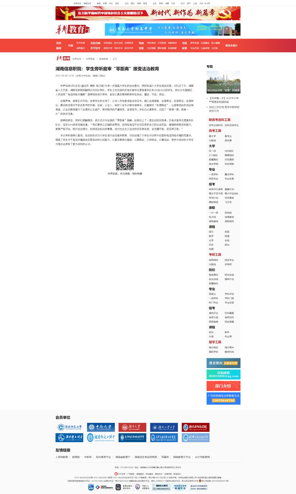 9月8日,华声在线发布《湖南信息职院:学生旁听庭审“零距离”接受法治教育》。