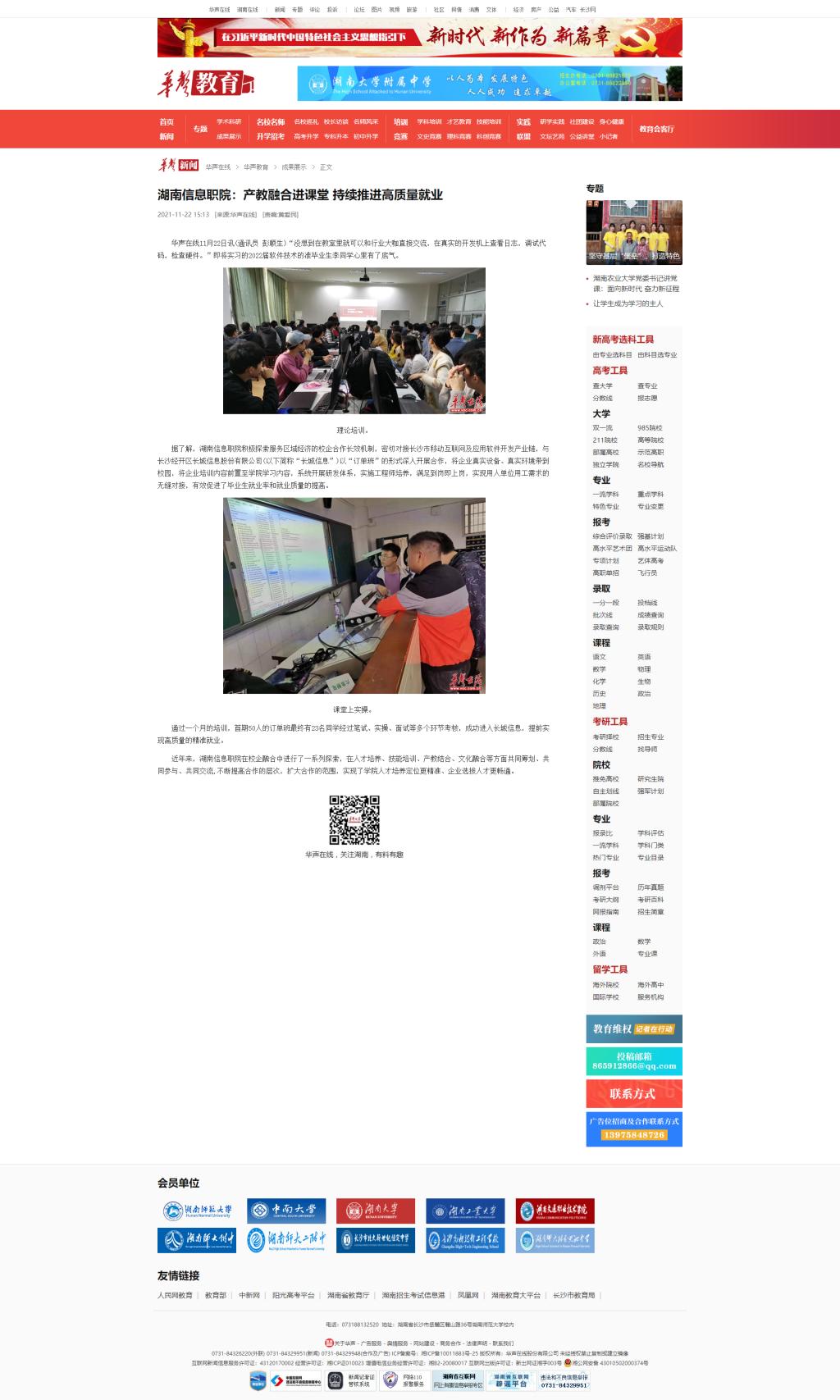 11月22日,华声在线发布《湖南信息职院:产教融合进课堂 持续推进高质量就业》。