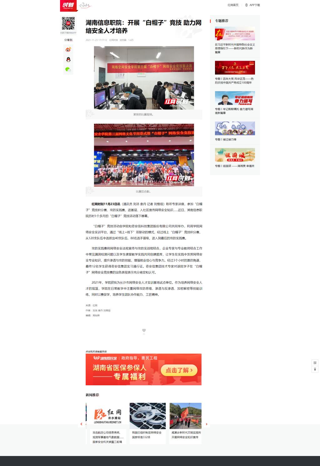 11月23日,红网发布《湖南信息职院:开展“白帽子”竞技 助力网络安全人才培养》。