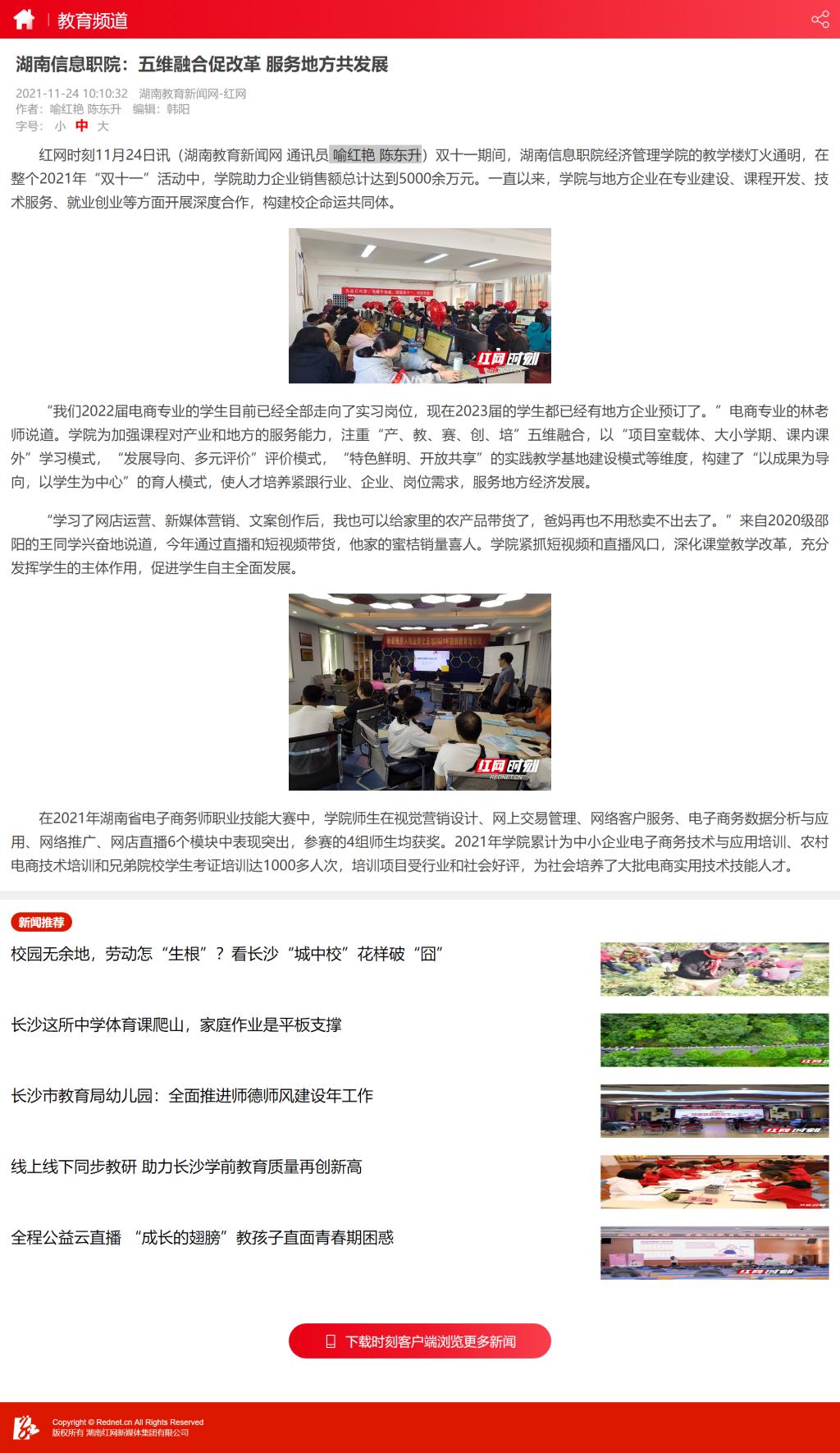11月24日,红网发布《湖南信息职院:五维融合促改革 服务地方共发展》。