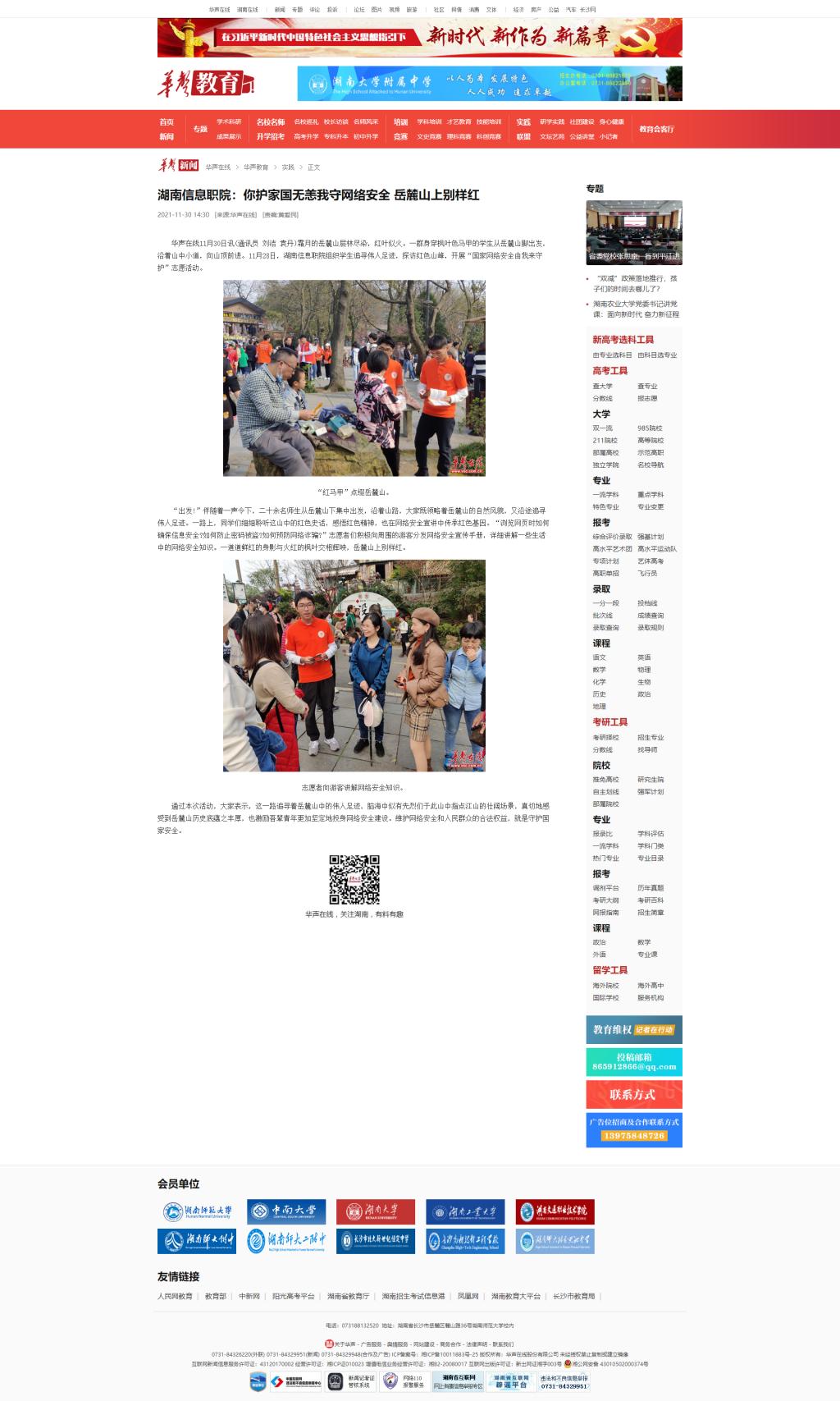 11月30日,华声在线发布《湖南信息职院:你护家国无恙我守网络安全 岳麓山上别样红》。