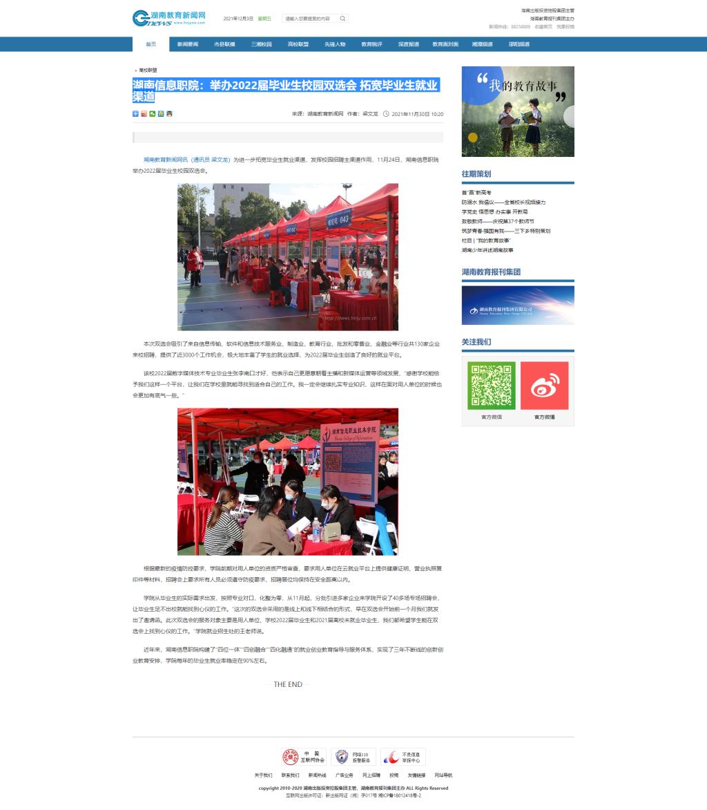 11月30日,湖南教育新闻网发布《湖南信息职院:举办2022届毕业生校园双选会 拓宽毕业生就业渠道》。