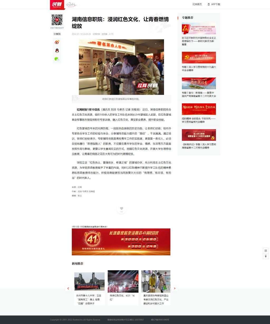 1月10日,红网时刻发布《湖南信息职院:浸润红色文化,让青春燃情绽放》。