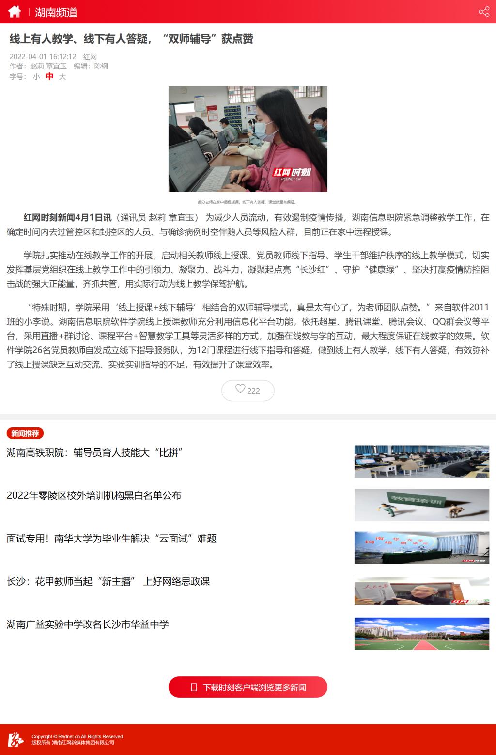 4月1日,红网时刻发布《线上有人教学、线下有人答疑,“双师辅导”获点赞》