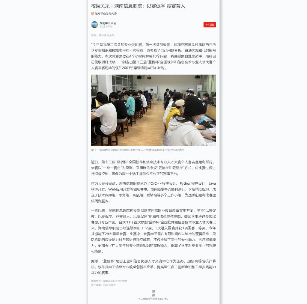 4月15日,学习强国发布《校园风采丨湖南信息职院:以赛促学 竞赛育人》