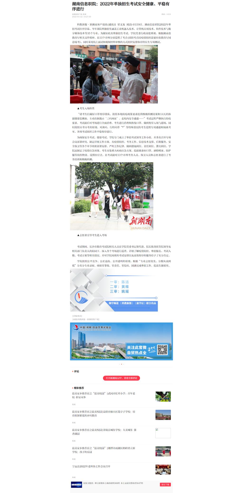 4月22日,新湖南发布《湖南信息职院:2022年单独招生考试安全健康、平稳有序进行》