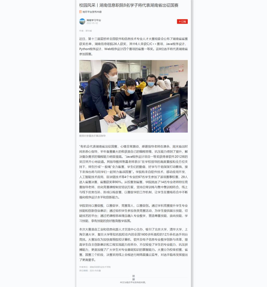 5月2日,学习强国发布《校园风采丨湖南信息职院8名学子将代表湖南省出征国赛》