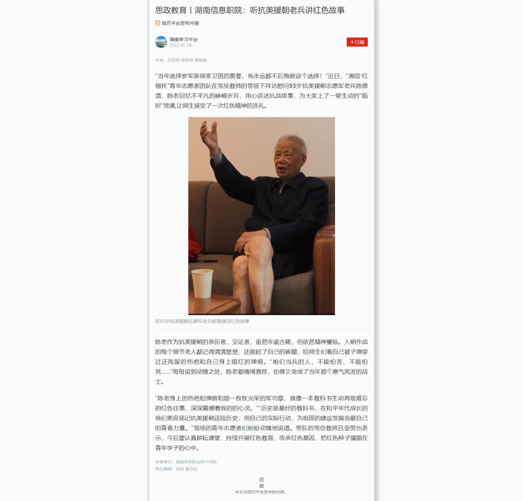 5月6日,学习强国发布《思政教育丨湖南信息职院:听抗美援朝老兵讲红色故事》