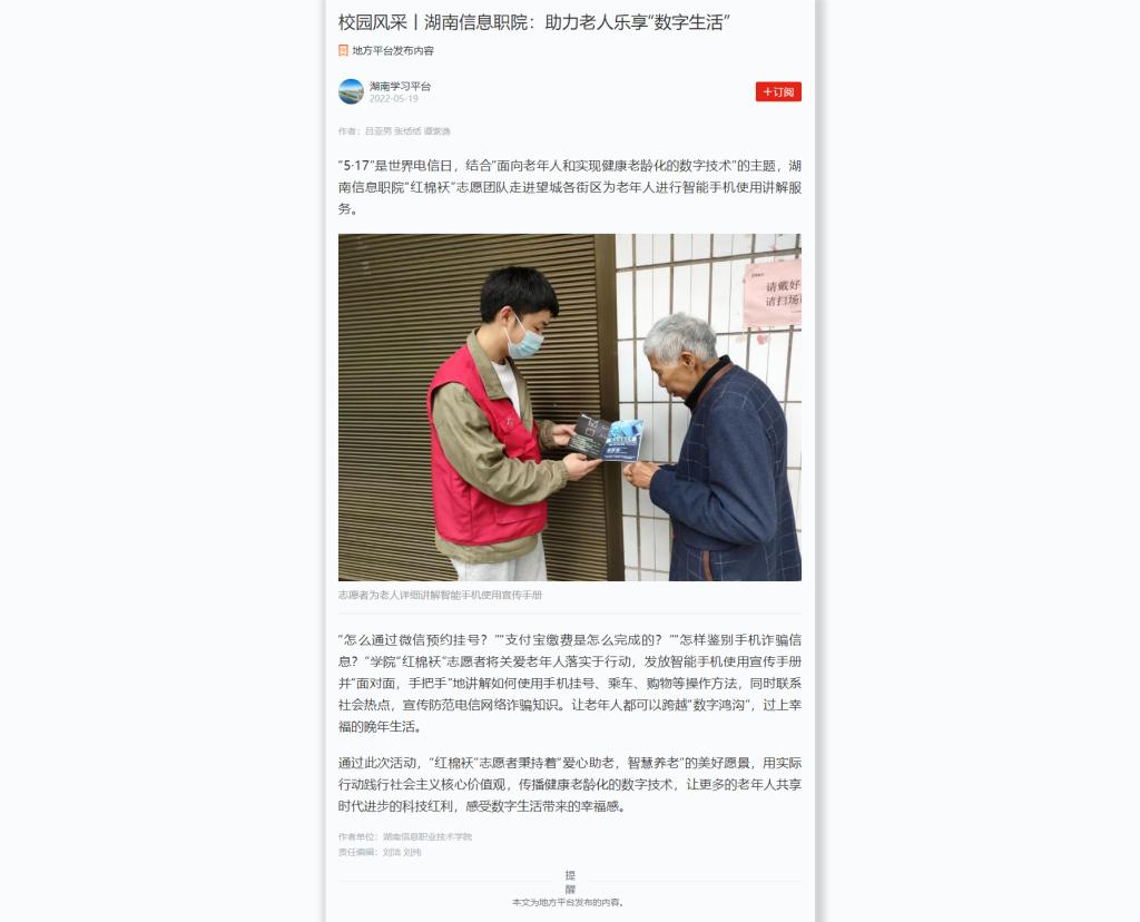 5月19日,学习强国发布《校园风采丨湖南信息职院:助力老人乐享“数字生活”》