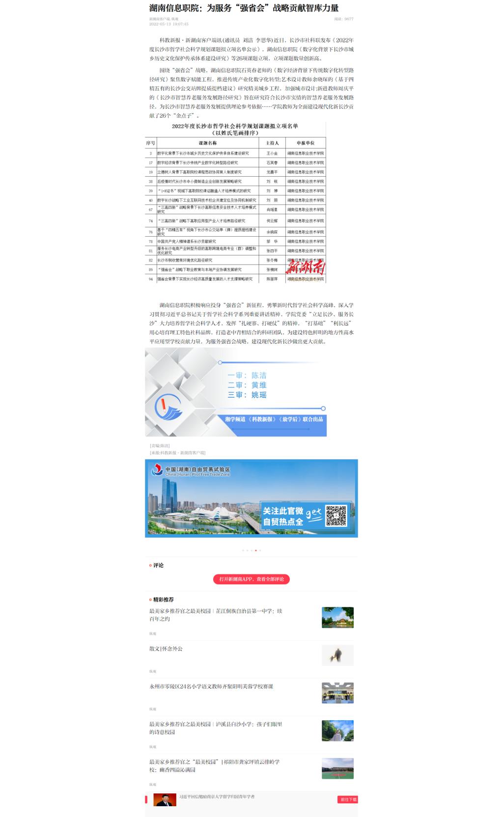 5月13日,新湖南发布《湖南信息职院:为服务“强省会”战略贡献智库力量》