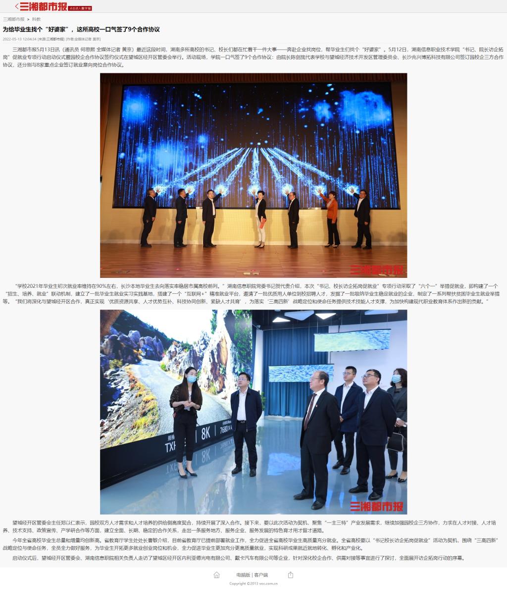 5月13日,三湘都市报发布《为给毕业生找个“好婆家”,这所高校一口气签了9个合作协议》