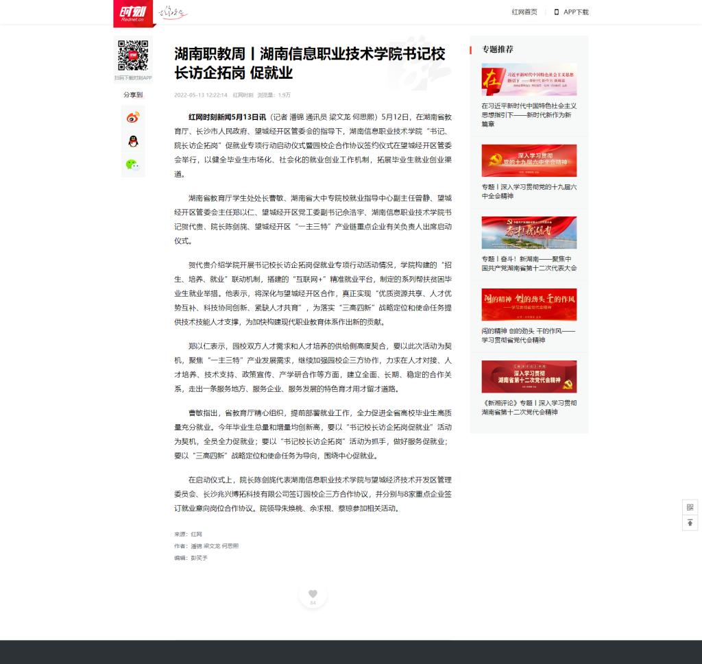 5月13日,红网时刻发布《湖南职教周丨best365手机版官方网站书记校长访企拓岗 促就业》
