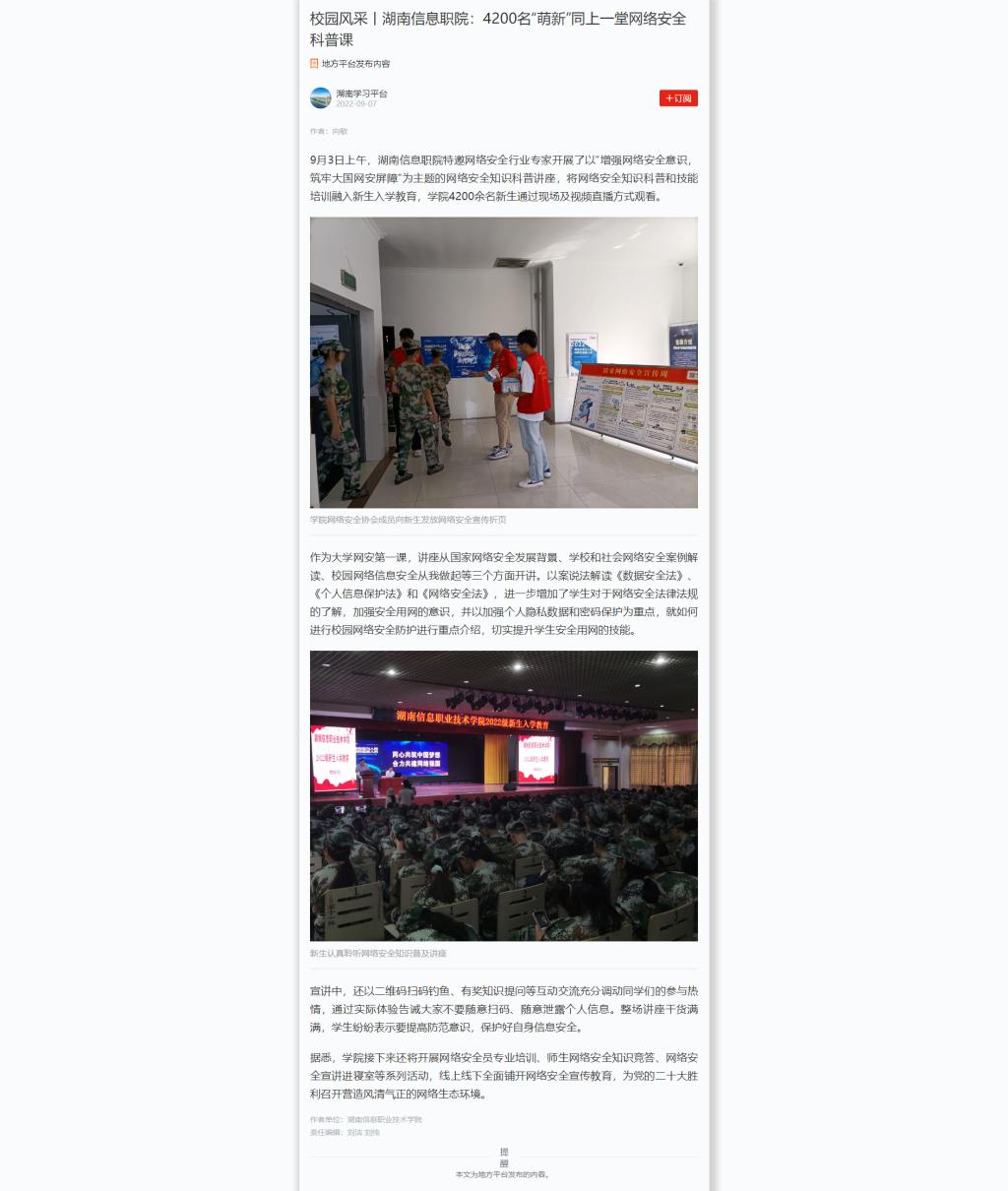9月7日,学习强国发布《校园风采丨湖南信息职院:4200名“萌新”同上一堂网络安全科普课》