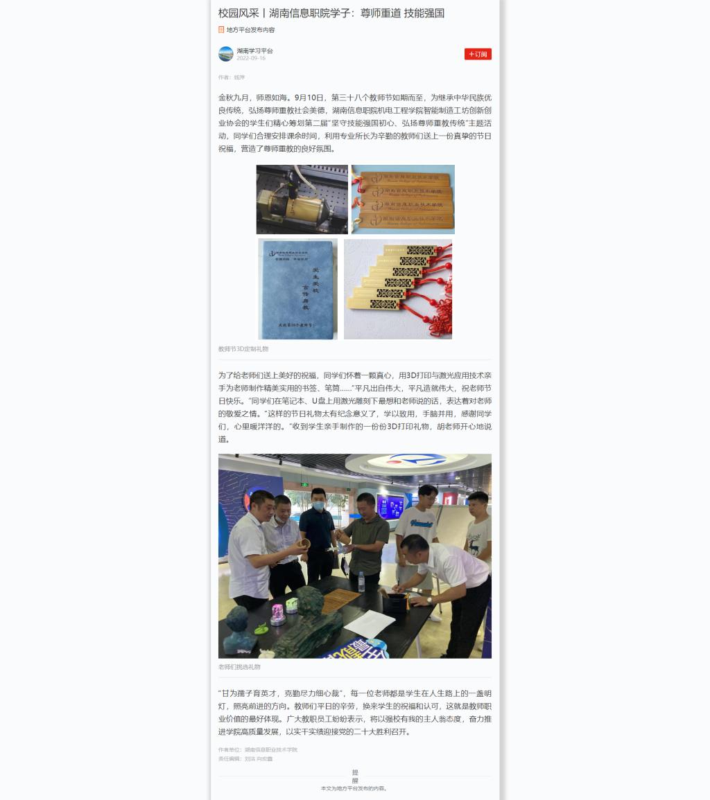 9月16日,学习强国发布《校园风采丨湖南信息职院学子:尊师重道 技能强国》